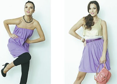 Na imagem acima, à esquerda, use a saia longa (La Vila, R$ 100*) como vestido: vista a saia como se fosse um vestido tomara-que-caia e esconda o cós virando-o para dentro. Deixe o comprimento que quiser, é só enrolar mais o top. Para ficar com cara de vestido, use um cinto fino para delinear a cintura